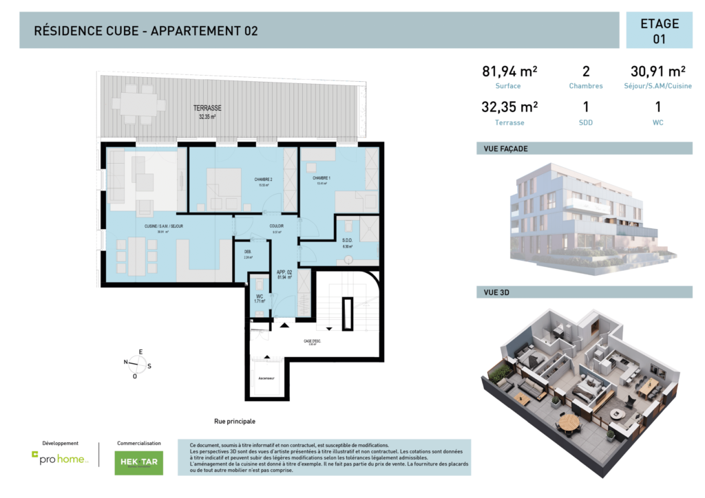 The apartment is located on the 1st floor and offers a living area of 81.94 m². It consists of an entrance with a storage space, a storage room and a separate toilet. The kitchen opens onto a spacious living room of 30.91 m² giving access to a large terrace of 32.25m2 with a splendid unobstructed view of the fields. The night area has two bedrooms with access to the terrace and a bathroom.