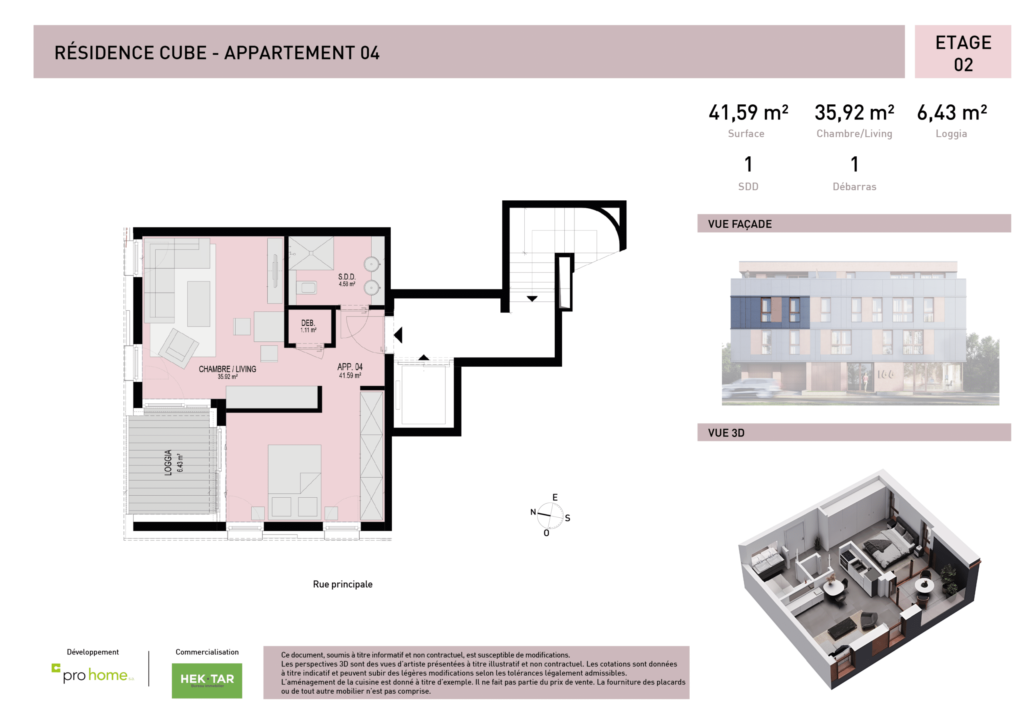 The apartment is located on the 2nd floor and offers a living area of 41.59 m². The apartment consists of an entrance with a storage room leading to an open kitchen and the living room. The living room gives access to a 6.43 m² west-facing loggia. The sleeping area has a bathroom and a spacious sleeping area with a long storage space.